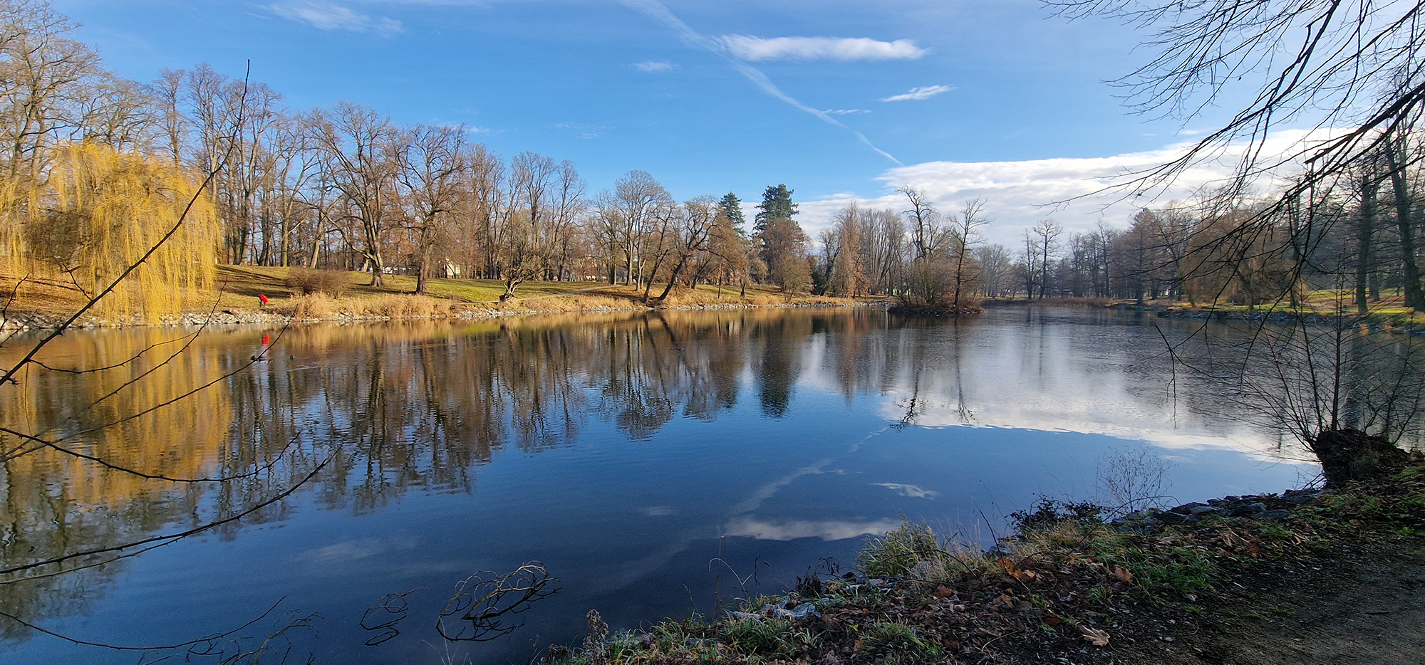 Jako téměř každý den jsme se prošly parkem, kde nedávno město postavilo obdobu historického altánku a před pár týdny obnovilo i most na ostrůvek. Park je poměrně rozlehlý, když ho obejdete okolo obvodních zdí, ujdete víc jak jeden a půl kilometru, když se projdete po všech cestách, můžete ujít i čtyři kilometry. V parku jsou dva rybníky, dětské hřiště a discgolfové hřiště, na informacích si můžete půjčit disky a zahrát si. Kolem lípy zamilovaných jsme prošly k zámku.