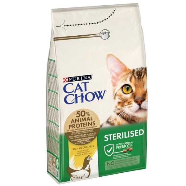 Špičkové kompletní krmivo Purina Cat Chow Special Care Sterilized vytvořené na míru potřebám kastrovaných koček. Granule obsahují kuřecí maso.
