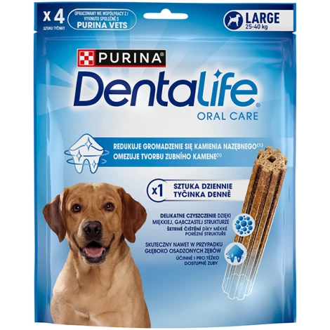 Purina DentaLife je atraktivní dentální pamlsek, který během žvýkání čistí zuby i jejich špatně dostupné části, jako jsou krčky nebo mezizubní prostory. Tyčinky mají nízkou výživovou hodnotu, jejich podáváním tak nenarušíte krmný režim pejska. Vhodné pro plemena o hmotnosti nad 25 kg.