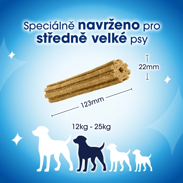 Purina Dentalife je atraktivní dentální pamlsek, který během žvýkání čistí zuby i jejich špatně dostupné části, jako jsou krčky nebo mezizubní prostory. Tyčinky mají nízkou výživovou hodnotu, jejich podáváním tak nenarušíte krmný režim pejska. Vhodné pro plemena o hmotnosti 12 - 25 kg.