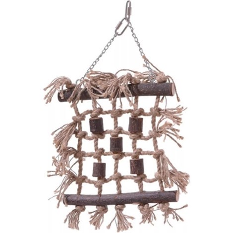 Šplhací stěna pro ptáky Quapas! je ručně vázaná síť z přírodního lana pro všechny druhy ptáků. Zábavné chvíle šplhání, houpání a objevování dovedou k dokonalosti kousky borovicového dřeva, které váš opeřený mazlíček může dle libosti okusovat. Hračku snadno zavěsíte do klece pomocí dvou háčků. Vyrobeno z bezpečných a netoxických materiálů vhodných pro ptáky.