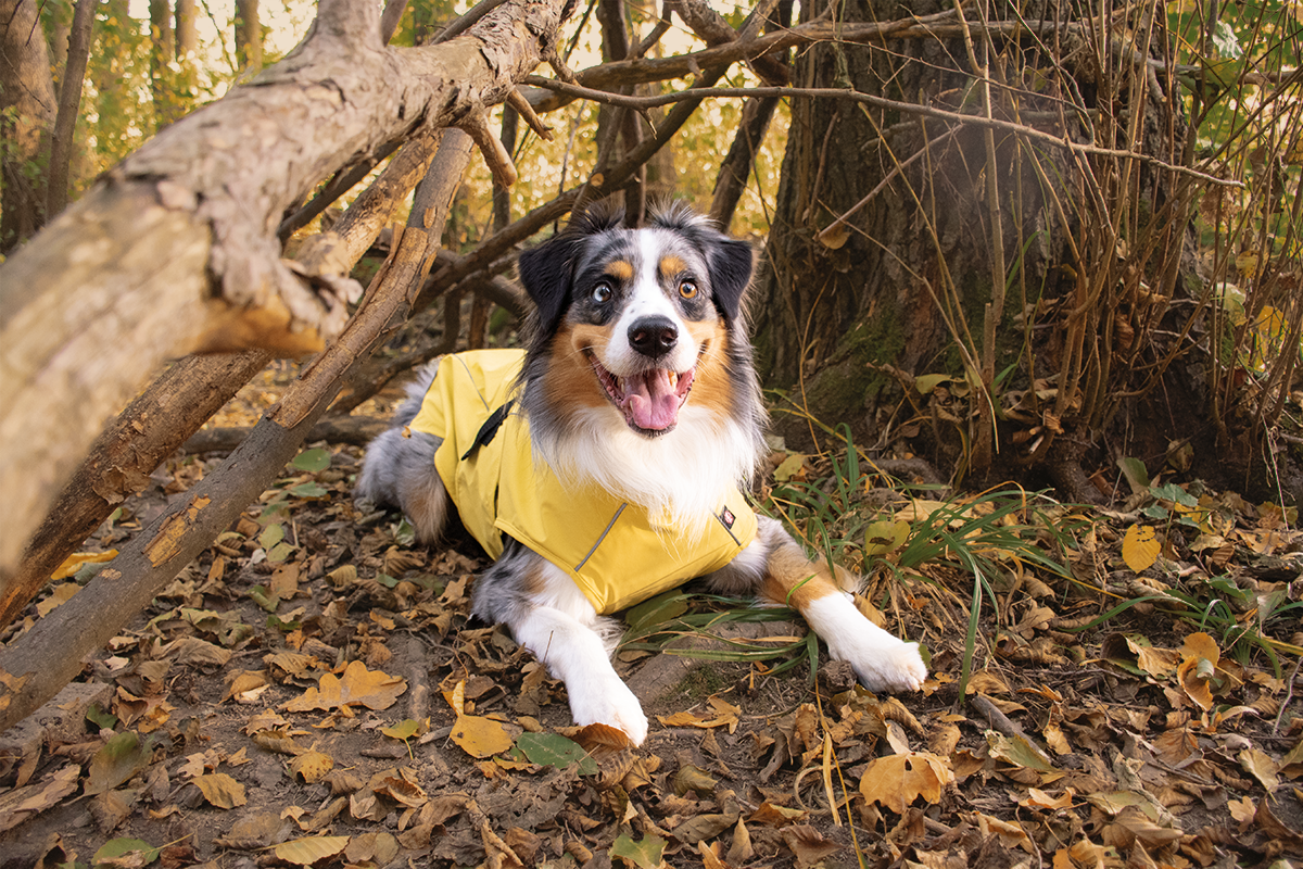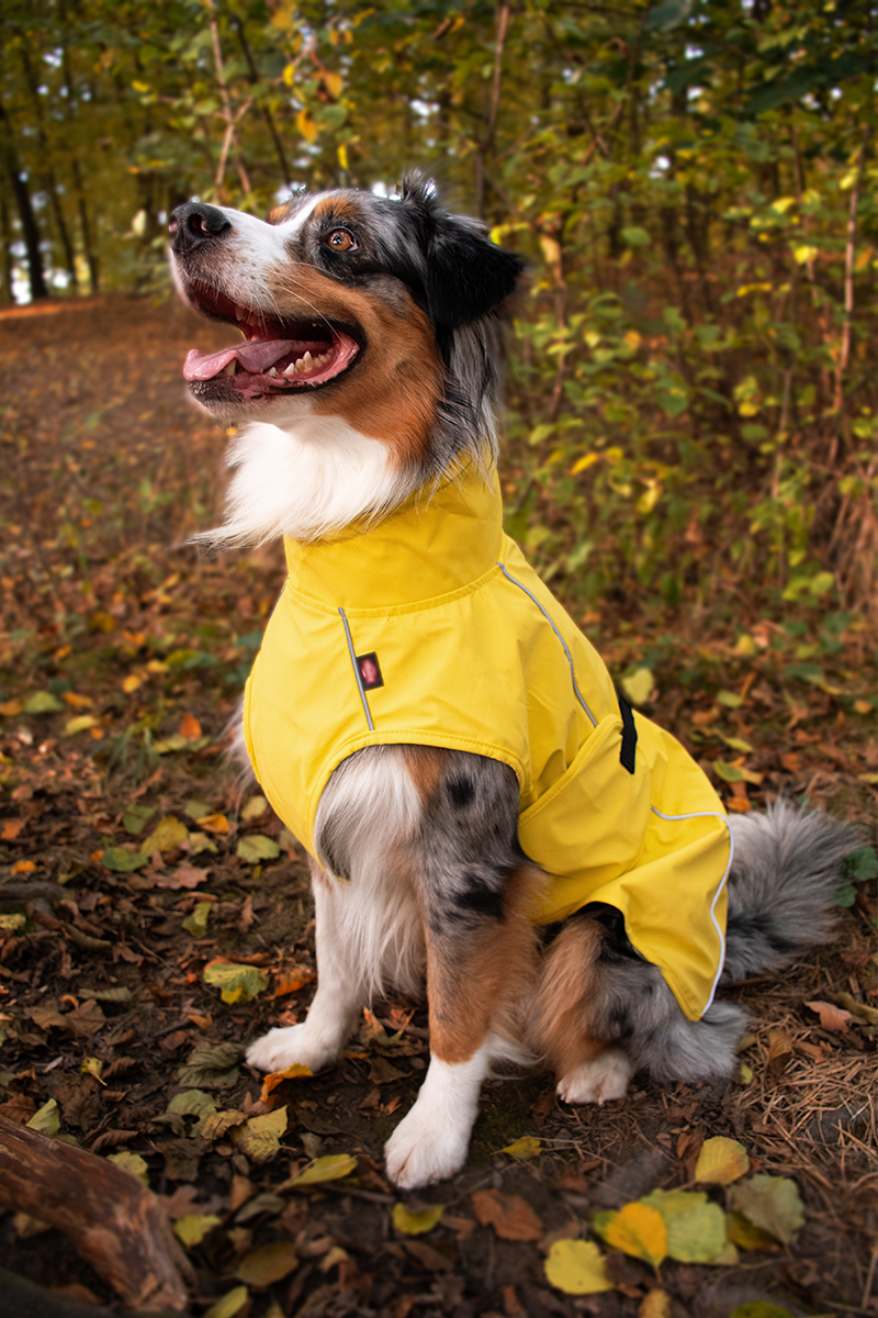 Musím říct, že na první pohled je pláštěnka velice líbivá. Chtěla jsem pro Ragiho pláštěnku ve výrazné barvě, což Trixie Vimy splňuje dokonale. Hodně dlouho jsem se rozhodovala mezi žlutou a tyrkysovou variantou. Nezdá se to, ale i když máte čtyřbarevného psa, tyrkysová barva na něm nevypadá vůbec špatně. Nakonec jsem vybrala žlutou, jelikož jsem si řekla, že v ní bude aspoň dobře vidět a občasné nenabití svítícího obojku nebude vadit.