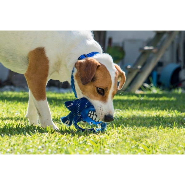 Chytněte, zatřeste a uvidíte to rodeo. Odolná pískací hračka pro psy Rogz Flossy Grinz zaujme po všech stránkách. Pejska pěkně nastartuje a připraví na parádní druh zábavy. S hračkou se díky čtyřem tkaným provazům dobře švihá, lehce hází a ještě líp přetahuje. Gumový povrch je příjemný ke skousnutí a bonusové vroubky pomohou k očistě zoubků. Uvidíte, že pejsek se bude usmívat skoro stejně jak samotný Grinz.