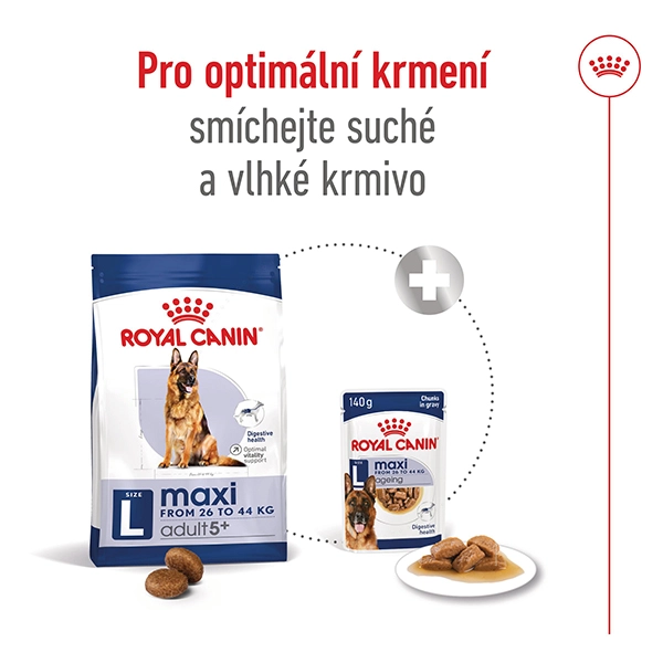 Royal Canin Maxi Adult (5+) je kompletní krmivo pro dospělé psy velkých plemen (26 - 44 kg) starších 5 let. Receptura obsahuje jedinečnou směs minerálů a živin, které podporují zdravé kosti a klouby. Vyvážený zdroj vlákniny a vysoce stravitelné bílkoviny pomáhají podporovat optimální zažívání a dobré zdraví trávicího traktu.