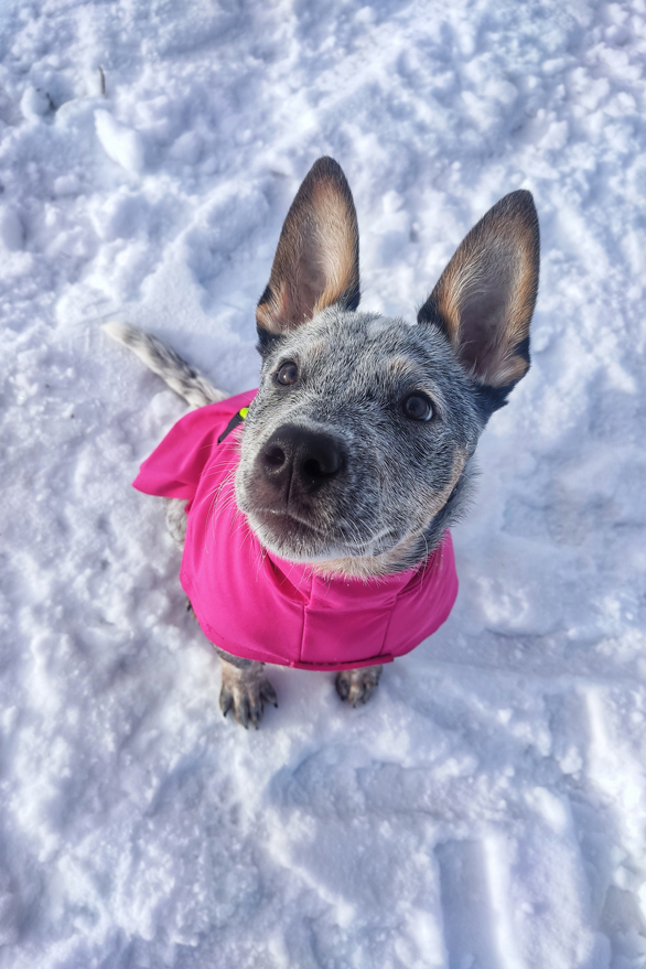 Je to fenka australského honáckého psa a v době natáčení měla jen čtyři měsíce. Doma jí říkáme Hel nebo Helmína, ale její originál jméno je Hialeah Warrigal paws. Je hravá, přítulná, ráda všechno ničí 😀 Když jsme doma a zrovna nespí, pořád nám nosí hračky a stále musí něco kousat a žvýkat. Když na ni nedáváme pozor, tak nám ráda kouše pantofle a boty, asi jako každé štěňátko. Je velmi učenlivá a hodně se učí od našeho staršího psa.