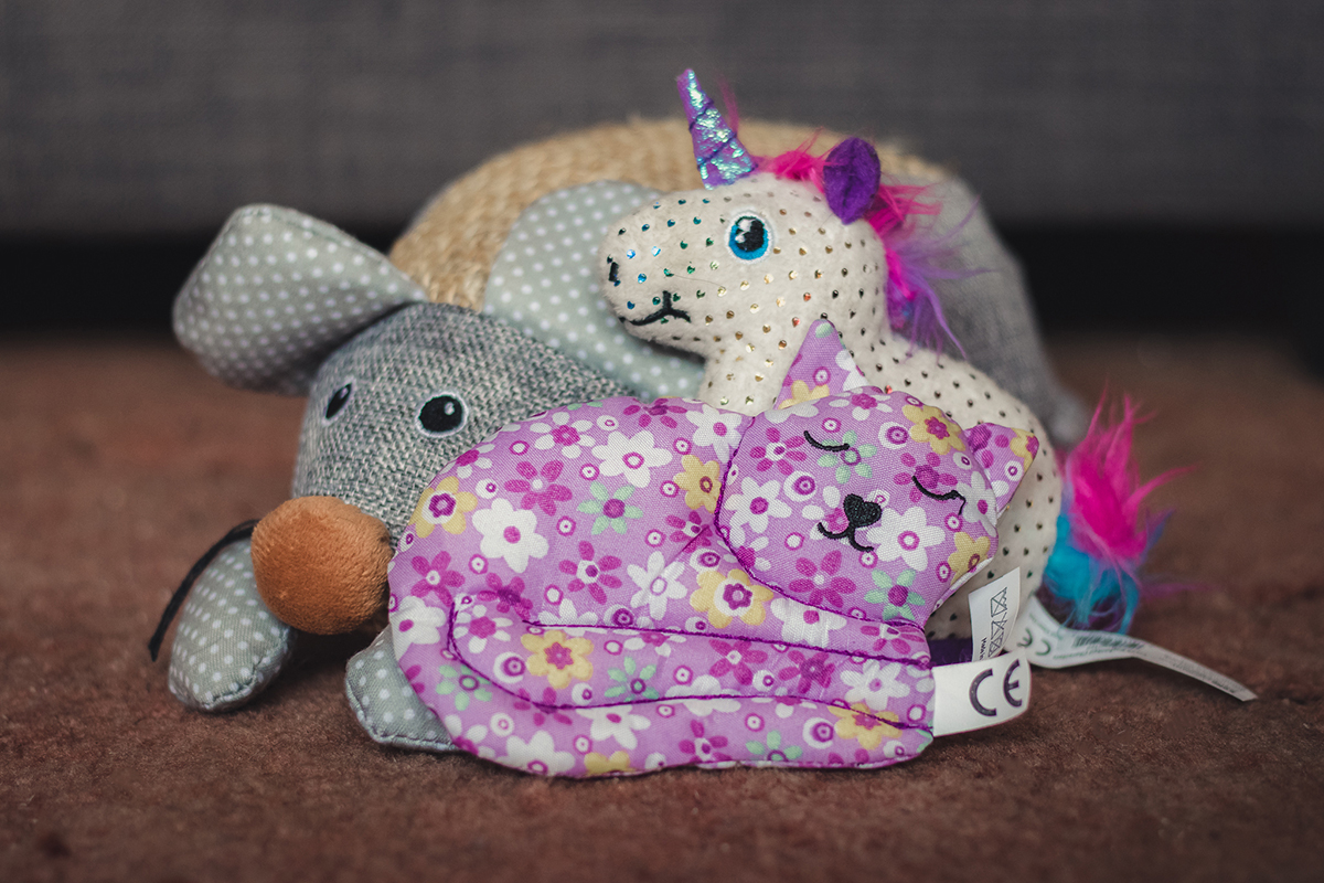 Vzhledem k tomu, že jsme neměli s podobnými hračkami žádné zkušenosti, vrhla jsem se do nákupu po hlavě a velikášsky. Pořídila jsem na vyzkoušení rovnou tři různé – Kong Enchanted (s šantou), Trixie bavlněnou kočičku (s kozlíkem) a větší sisalovou myš také od Trixie (s šantou). Při testu se prostě nesmí nic zanedbat, navíc Micky jsou dvě, takže je musím spravedlivě podělit.