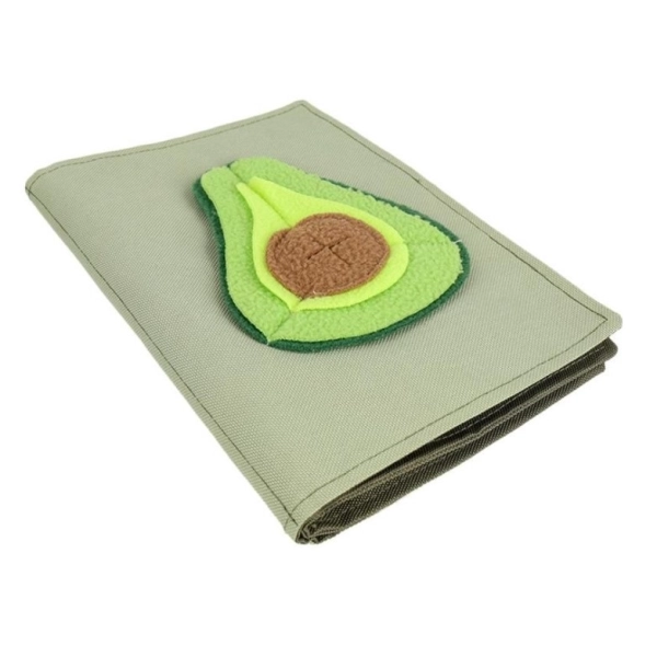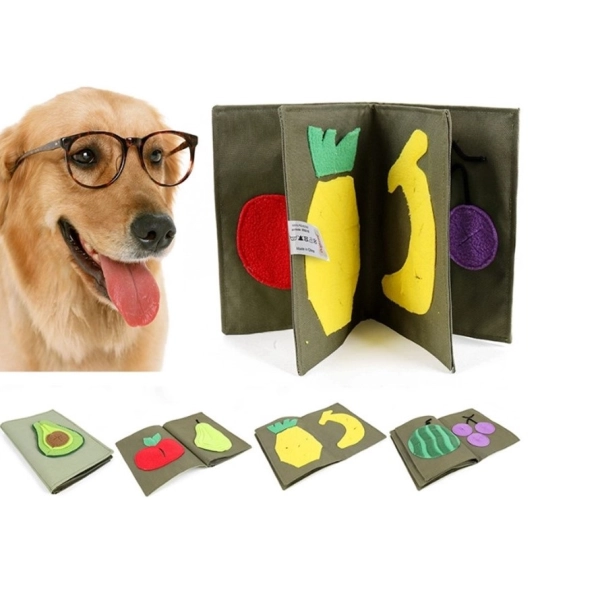 Snuffle Toy Book je interaktivní hračka pro psy. Jde o čmuchací podložku ve tvaru knihy se čtyřmi stránkami. Na každé je schovávačka ve tvaru ovoce, do které ukryjete pamlsek. Pejsek se tak snaží knihou listovat a hledat ukryté dobroty.
