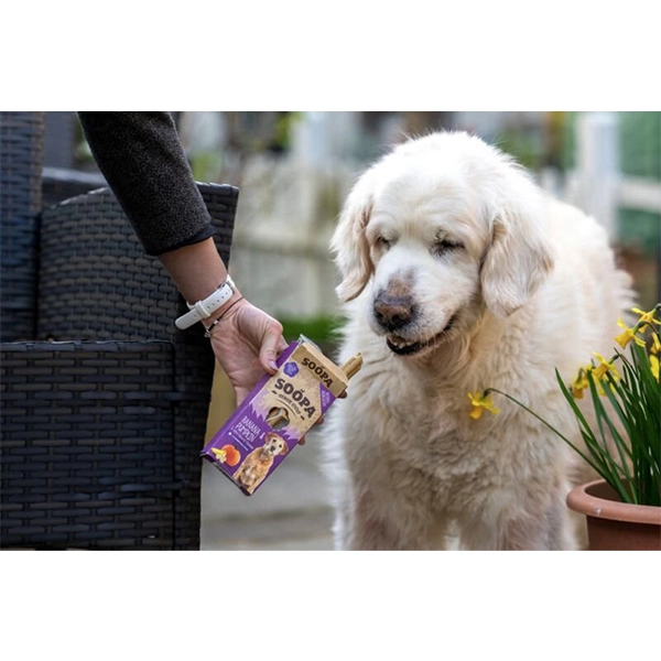 Dentální tyčinky Soopa Senior s banánem, dýní a lněným semínkem jsou přírodním veganským pamlskem vhodným pro starší pejsky. Tyto tyčinky jsou měkčí než ostatní pamlsky Soopa. Pomáhají udržovat čisté zuby a dásně a potlačovat zápach z tlamy. Bez obsahu obilovin, dochucovadel a umělých barviv.