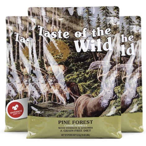 Gurmánské bezobilné krmivo Taste of the Wild Pine Forest. Jak již název napovídá, dominantní surovinou je vydatné zvěřinové maso. Pine Forest jsou granule pro pejsky každého plemene i jakéhokoli věku.