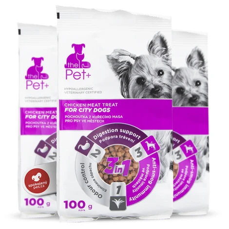 The Pet+ Dog City Treat jsou drobné pamlsky pro městské chlupáče! Složení se zaměřuje na posílení přirozené imunity a snížení zápachu exkrementů. Výborná chuť, které vévodí drůbeží a rybí maso s králičími vnitřnostmi.