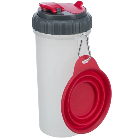 Trixie cestovní zásobník na vodu a krmivo bude skvělou zásobárnou čerstvé vody a granulek kdekoliv na cestách. Lahev má dvě oddělené komory s vodotěsným víkem, z nichž každá má svůj samostatný otvor. Pro napití či občerstvení psa stačí použít přiloženou silikonovou misku.