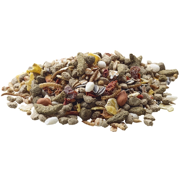 Obiloviny (ječmen 8 %), vedlejší produkty rostlinného původu, zelenina (hrášek 8 %, rajčata 2 %), semena, rostlinné bílkovinné extrakty, ovoce (papája 2 %, rozinky 1,5 %), hmyz (mouční červi 4 %), ořechy, minerální látky, kvasnice, oleje a tuky, byliny, FOS, MOS, měsíček, jádra z hroznového vína, řasy, juka.