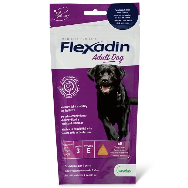 Flexadin Adult Dog je kloubní výživa ve formě žvýkacích tablet, která podporuje pohyblivost a pružnost kloubů psů v aktivním věku. Obsahuje nedenaturovaný kolagen typu II, který působí skrze imunitní systém, omega-3 mastné kyseliny a vitamín E s antioxidační aktivitou.