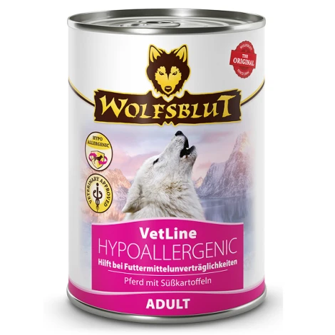 Konzerva Wolfblut VetLine Hypoallergenic – šetrné dietní krmivo pro psy s potravinovými alergiemi a intolerancí. Hypoalergenní koňské maso, bez obilovin, vhodné jako eliminační dieta. Podporuje zdraví kůže, trávení a celkovou pohodu psa!